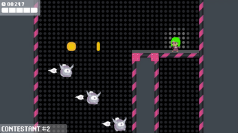 Contestants, come on up! Cash, prizes, and glory await you at the top of Fist's Elimination Tower, a 150-story obstacle course full of robot bunnies that explode on contact and fists that spring out of the wall. Jump on all of the floor's robots in one consecutive chain to bounce your way up to the next floor, but make sure that you don't take more than 5 seconds or break your chain, or you'll get zapped. Also... LOOK OUT FOR FISTS!